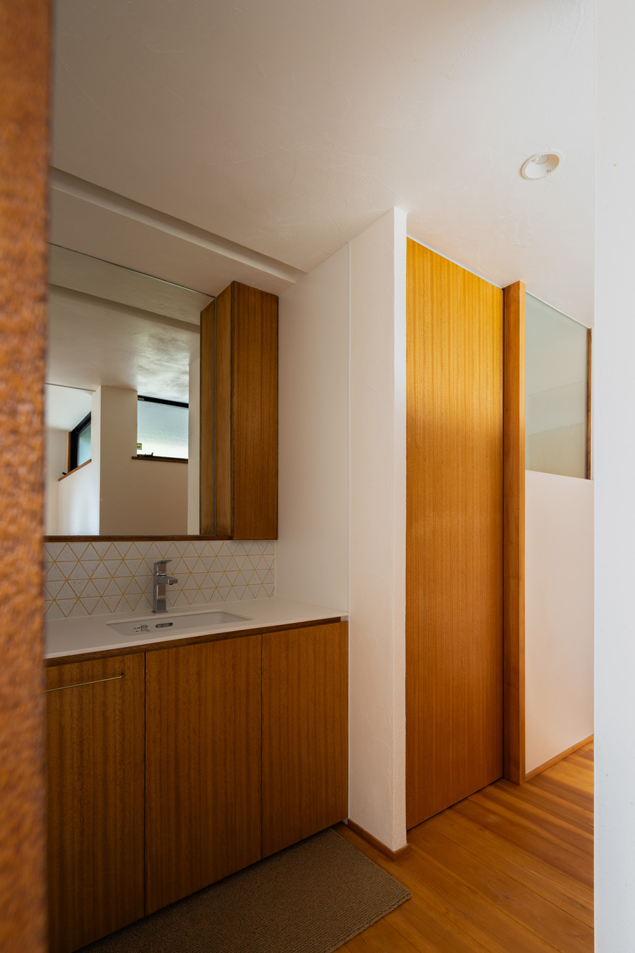 大きな鏡の横に縦長の収納。